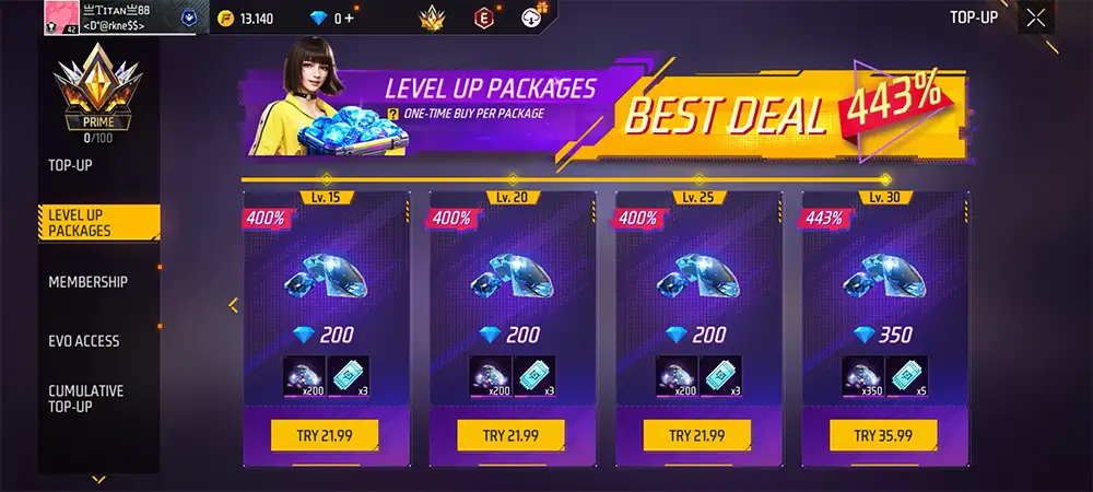 با ورود به بخش Level Up Packages از منوی سمت چپ در قسمت Top-Up، میتوانید سطح و بستههای فعال را ببینید.